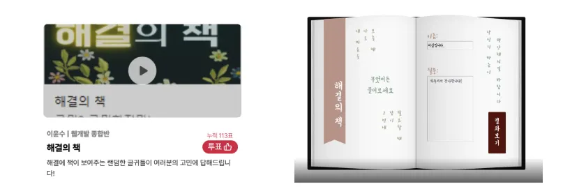 ‘해결의 책’이라는 간단한 웹 애플리케이션을 만들었다. 고민을 적으면 랜덤으로 글귀를 보여주는 방식이다. 어디 가서 보여줄 정도도 아니고, 포트폴리오로 활용하기에도 부족하지만 지금도 자랑스럽다. 첫 번째 프로젝트였고, 내가 뭔가를 만들어냈다는 사실이 기뻤다.